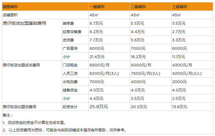 1、店鋪投資∶假設投資者是在縣級城市開一家比較小型的煲仔飯店,那煲仔飯店的店鋪面積并不需要太大,30平方米大小的店面就已經足夠了了,按照現在的市面鋪租標準,煲仔飯店的店鋪租金大約需要2萬元,如果投資者想要對店面進行精裝設計的話,那所需要的在店鋪的裝修方面的資金會高一些,大約是5萬元。