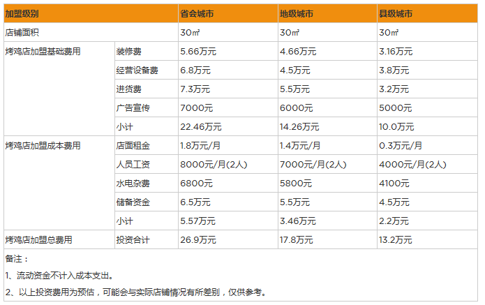 除了以上這些開銷,開烤雞店還需要預備一部分流動資金,這部分資金主要用于購買食材和發放工資。購買食材的費用視店面的經營情況而定,每月幾萬元比較適中。工資方面,由于店面比較小,員工兩三個就足夠,耗費的資金不多。(以上數據僅供參考,不作為任何投資承諾與保證)。