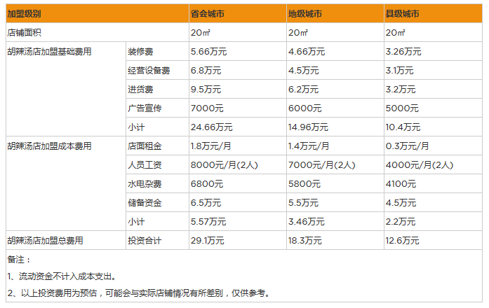 6、流動資金:每個加盟店都需要準備一筆流動資金,以備不時之需,一般對于胡辣湯店鋪來說準備兩萬差不多夠。