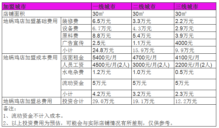 地鍋雞人們喜愛的食物。開個家很有前景。路過地鍋雞店的朋友不難發現,店內總是座無虛席,人山人海。利潤當然可觀。在當地開一家地鍋雞賺錢嗎?小編采訪了杭州一家加盟店的工作人員,了解到這家地鍋雞店的日客流量可以達到100人,平均消費30元,日營業額3000元,月營業額9萬元。公司綜合毛利率46%,月毛利4.14萬元。扣除每月經營成本后,包括店面租金5400元(45平方米)、員工工資5000元(2人)、水電雜費1000元。一個月的凈利潤可以達到3萬元左右。一年內,加盟商至少可以實現36萬元的凈利潤。這樣的利潤在同一規模的餐廳中非常令人羨慕,而且利潤率還是非常大的。