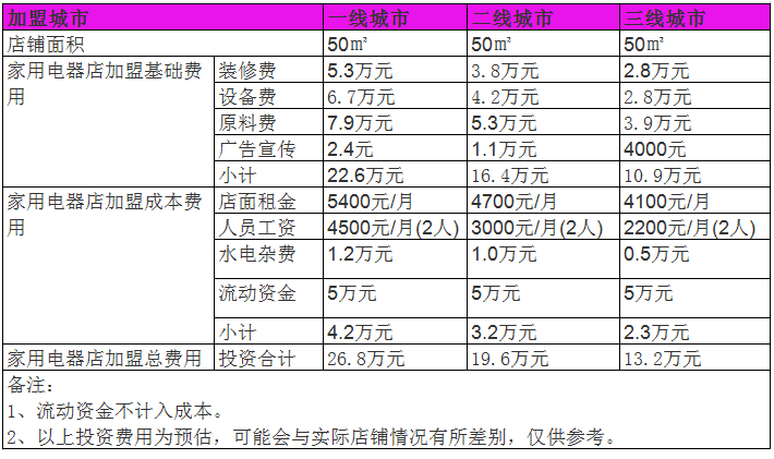 裝修費:3萬元(600元/㎡*50㎡),經營設備費:5萬元,首批進貨費/原料費:5.5萬元,廣告宣傳及開業費:8000元,家用電器加盟基礎費用總計:14.3萬元,門店租金:6800元/月(4.5元/天/㎡),人員工資:2萬元/月(4000元/月/人*5人),水電雜費:900元,流動/儲備資金:8.03萬元,家用電器加盟成本費用總計:2.77萬元,家用電器加盟總費用:17.07萬元。