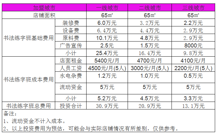 開個練字班需要投資多少錢?其實,開個練字班需要投資的整體費用也不是很貴,在此小編以店鋪面積按65㎡為例,裝修費3.25萬元,門店租金7400元/月,經營設備費5.2萬元,人員工資8000元/月,首批進貨費/原料費2.5萬元,水電雜費1000元,廣告宣傳及開業費6000元,流動/儲備資金4.62萬元,練字班加盟總投資費用13.19萬元,流動資金的算法為(人員工資/月+房租/月)*3個月,四舍五入取整數,并且不計入成本支出,以上投資費用為預估,可能會與實際情況有所差別,僅供參考。