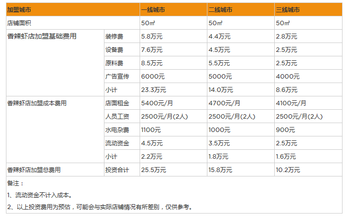 2、加盟商如果想要開一家香辣蝦店的話,投資費用不算太高,投資只需要8萬元就可以開張香辣蝦店,年利潤是30萬元。并且凡是加盟了香辣蝦店的話,總部還會提供一些相關的優惠政策和加盟支持,為加盟商也節省了不少來京費用,已經讓加盟商也賺取更多的利潤收入。