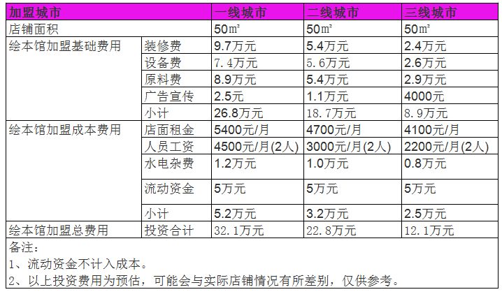 如果投資者們不愿意太過(guò)麻煩,或者擔(dān)心自己沒(méi)經(jīng)驗(yàn),不怎么懂經(jīng)營(yíng)的話,也可以選擇合適的店面加盟,對(duì)比一個(gè)人開(kāi)店來(lái)說(shuō)的話,還是要輕松點(diǎn)。如果選擇加盟的話,單店加盟費(fèi)為1-5萬(wàn)元,綜合的為5-10萬(wàn)元,復(fù)合館的費(fèi)用大致在15-20萬(wàn)之間。開(kāi)一家50平米的繪本店,成本12萬(wàn)左右。