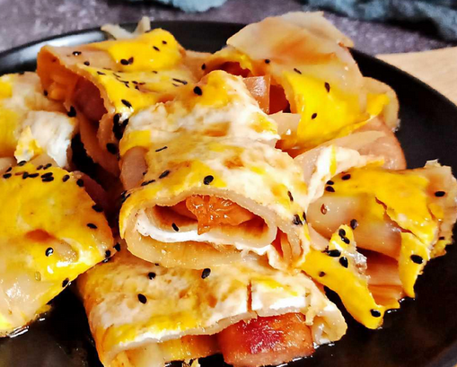 烤冷面是在一塊鐵板上,攤一塊方形的面皮,打一個(gè)雞蛋,煎好后用鏟子切開(kāi),然后加上火腿腸、凍豆腐等等配菜,最后撒上辣椒面、醬汁等等調(diào)味作為結(jié)束,不得不說(shuō)用料還是很豐富的,而且冷面筋道彈牙,味道真的相當(dāng)不錯(cuò)。