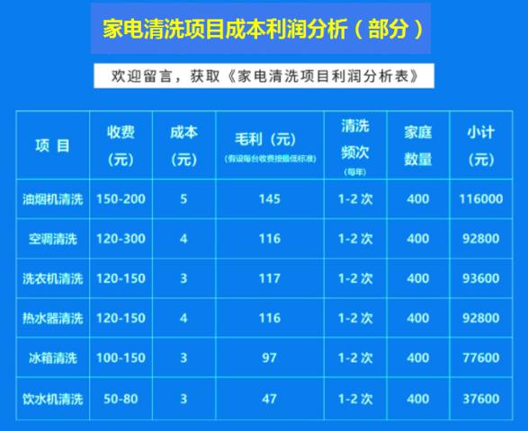 家電清洗服務除了人員成本就沒別的了,其他的都是利潤。利潤高,需求也大,這么多的家庭用戶,一天做三五家,兩個人一年做個1000多戶還是沒問題的,一戶平均收取500元,這么算下來50萬了。